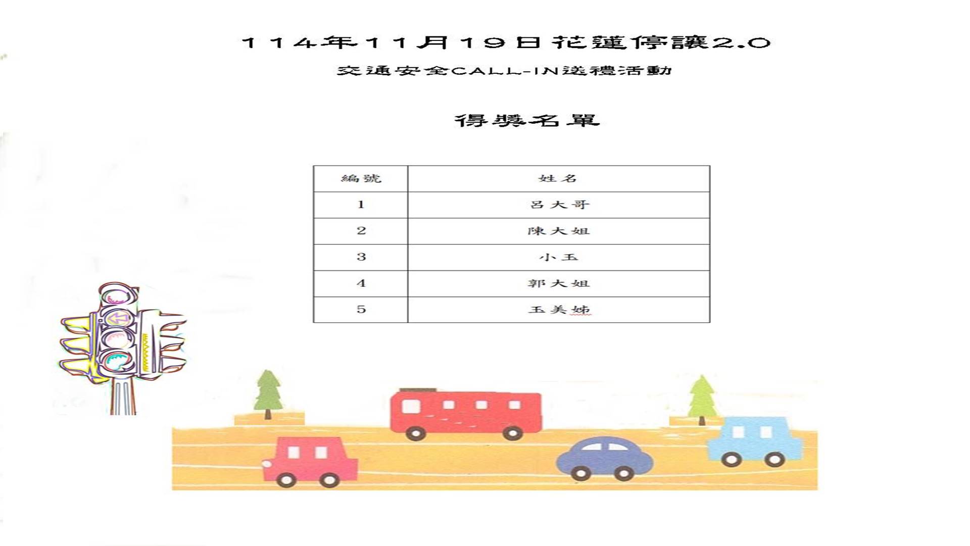 114年11月19日「花蓮停讓2.0」交通安全CALL-IN送禮活動 一、活動日期:114年11月19日 二、節目名稱:歡喜再相逢 三、CALL-IN題目 📌 第1題|微型電動二輪車 題目: 閱讀更多 » 2025 年 11 月 20 日